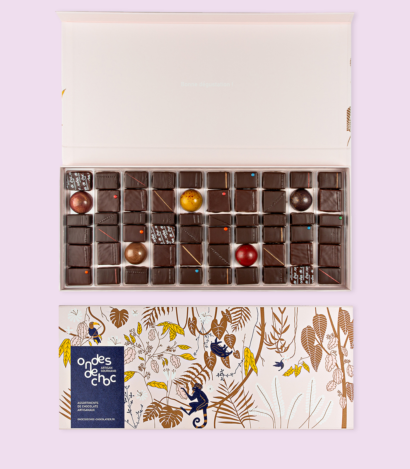 Partager une onde de plaisir en dégustant cet assortiment de créations originales de bonbons de chocolat ganaches et pralinés !